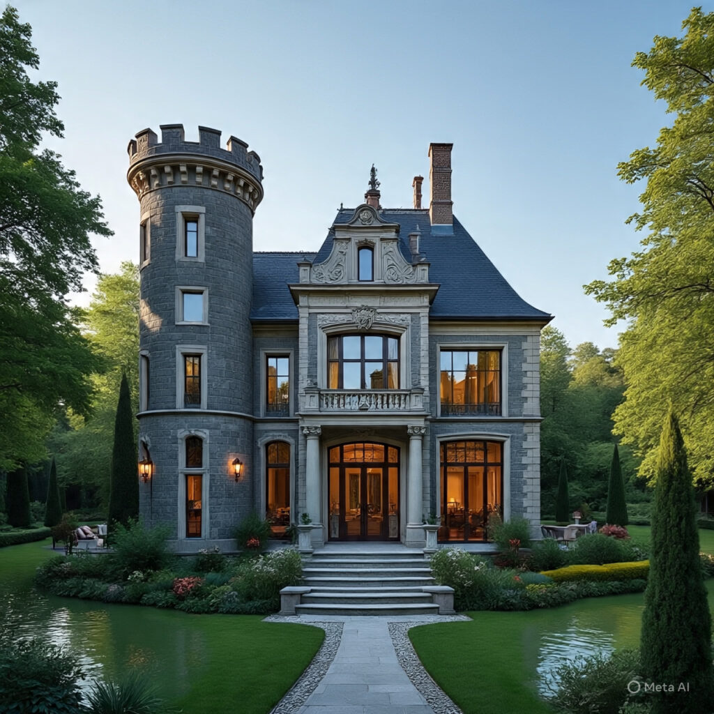 Inspired by medieval castles but with a contemporary touch, this mansion features stone towers, majestic halls, and classic details blended with modern heating and security technologies.