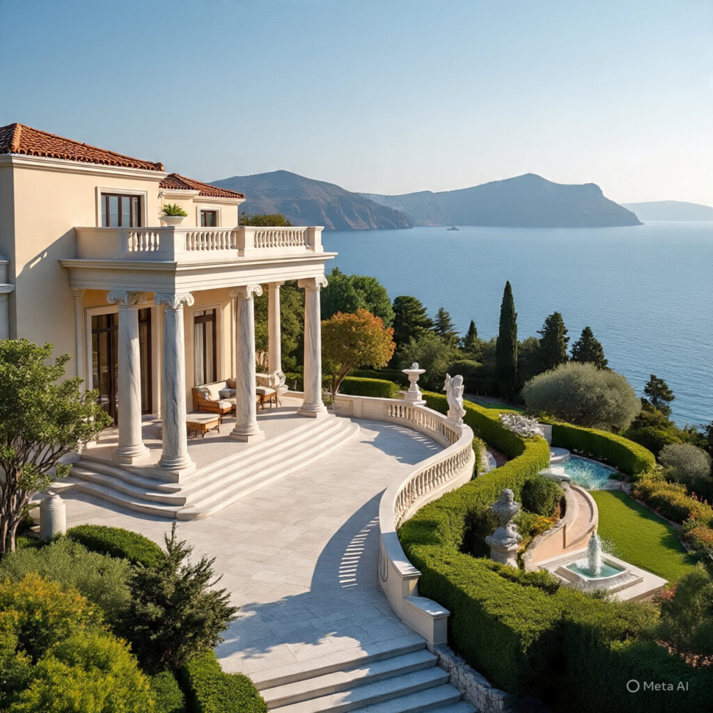 With marble columns, balconies overlooking the Aegean Sea, and classical inspiration, this mansion blends Greek tradition with modern finishes and comfort.