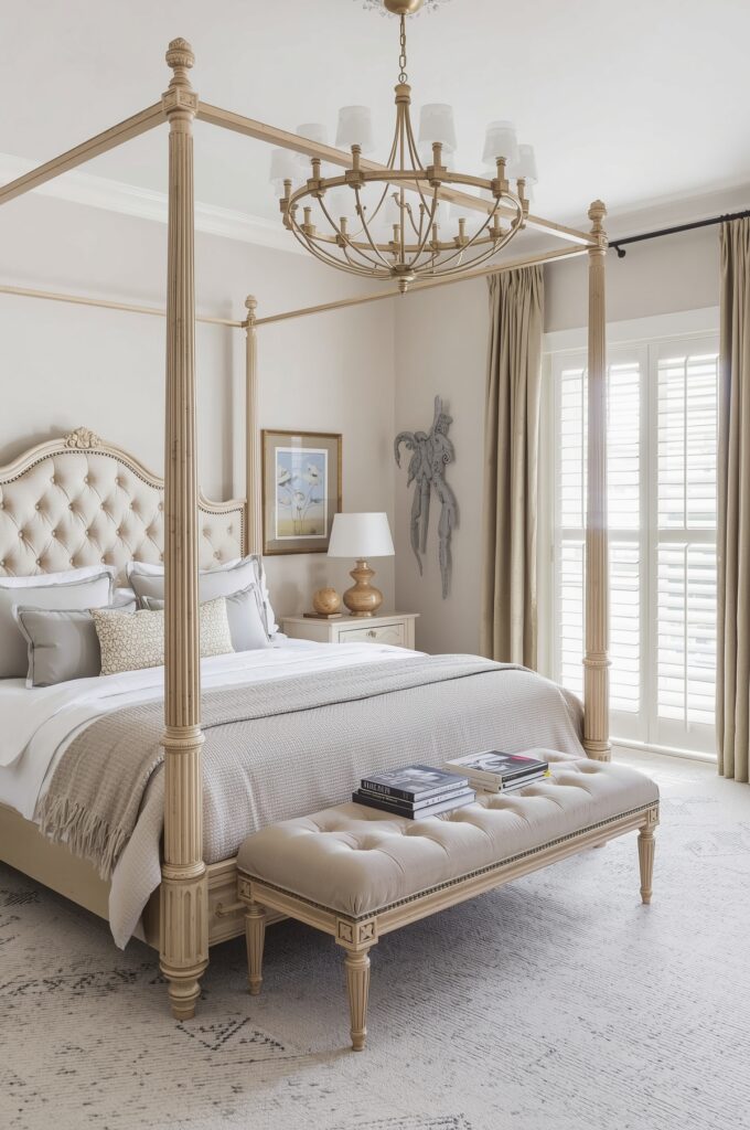 Why it works: The bed acts as the centerpiece, setting the tone for timeless elegance.