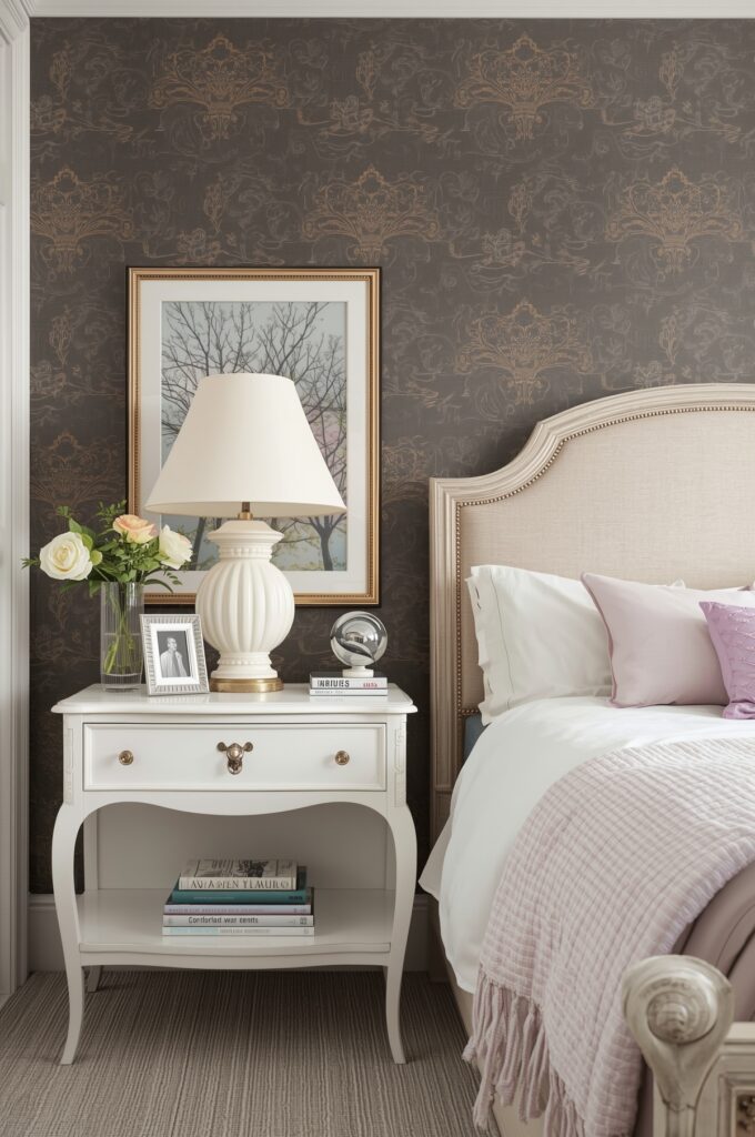 Opt for curved, ornate nightstands with subtle carvings, or add modern ones with vintage touches like antique knobs.