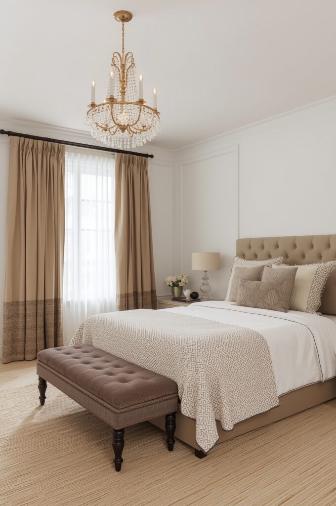 Subtle metallics—like gold-framed mirrors, brass lamps, or drawer pulls—elevate your bedroom’s luxurious vibe.