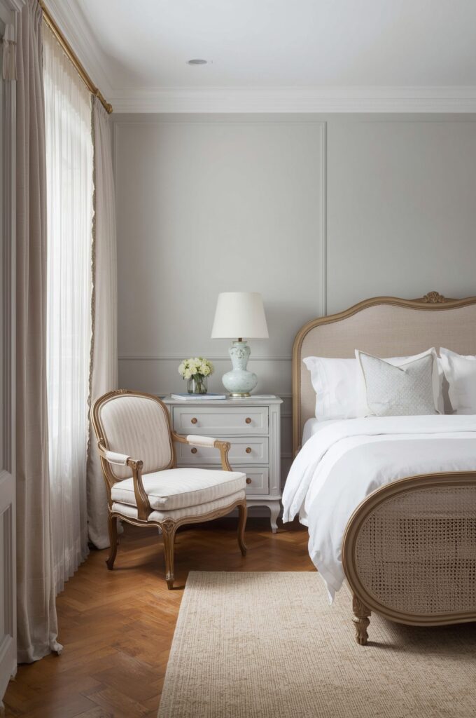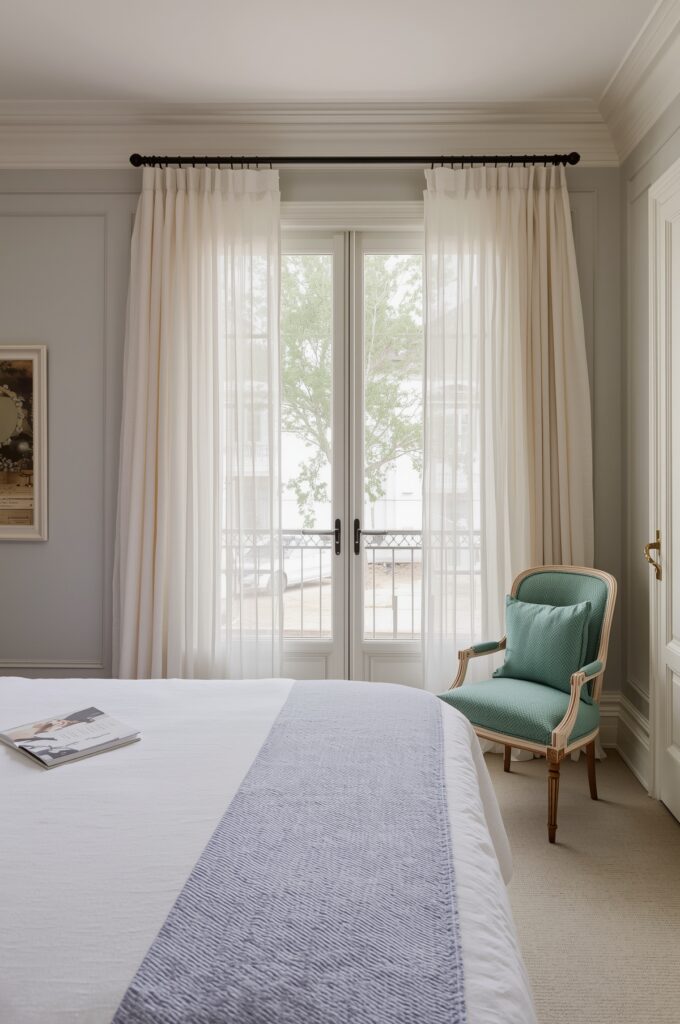 French bedrooms often feature light, breezy drapes in whites or creams that let natural light softly filter through.
