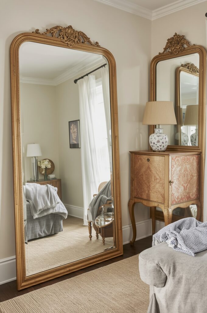 Oversized floor mirrors or wall mirrors with gilded frames amplify light and expand your bedroom visually.