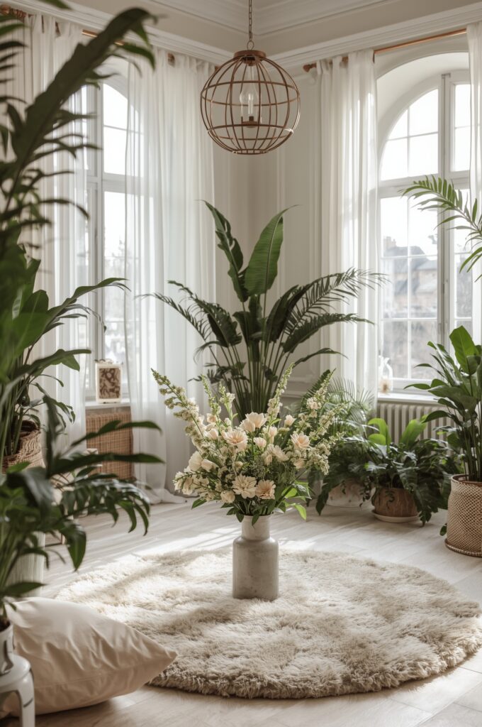 A simple vase of fresh flowers or indoor plants adds life and softness to the bedroom décor.