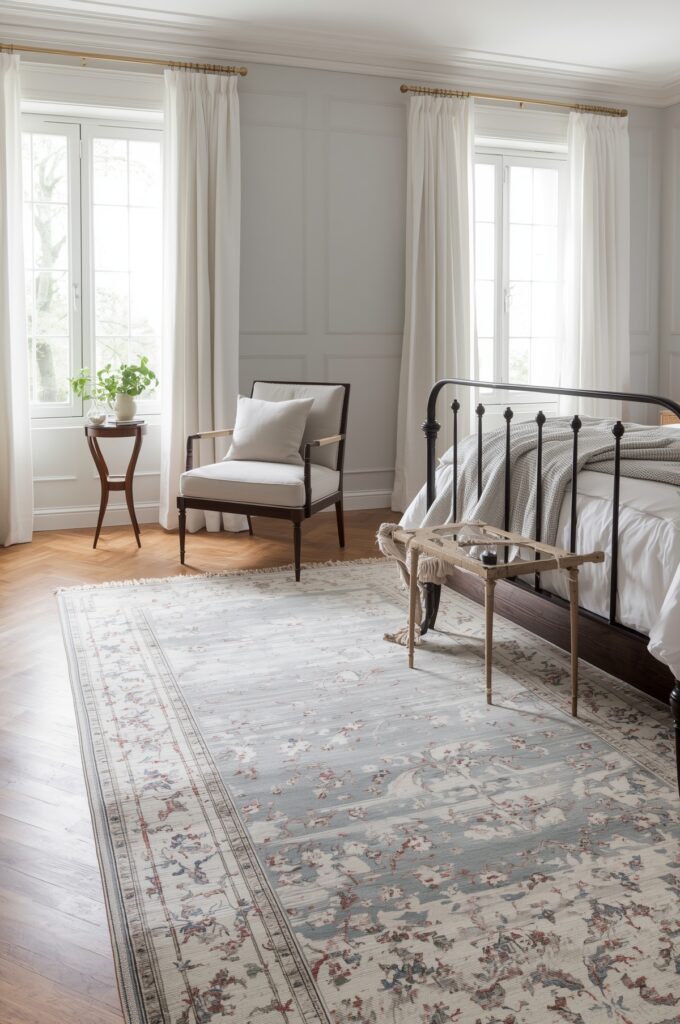Rugs with muted patterns—floral, oriental, or soft geometrics—anchor the space and add warmth.