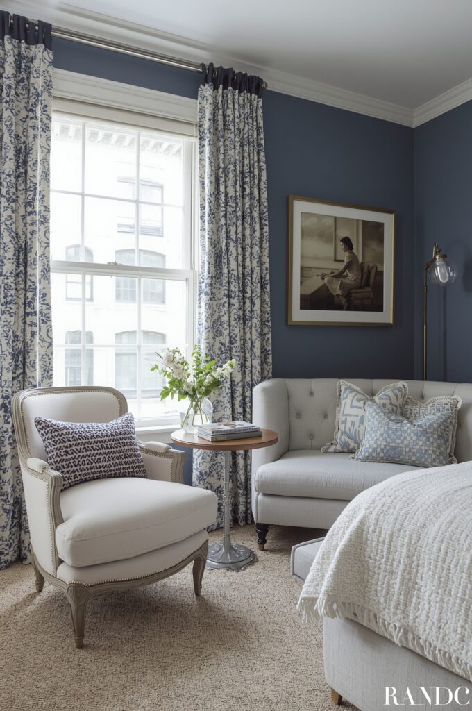 Place a French bergère chair or tufted chaise in the corner with a side table for a cozy reading nook.