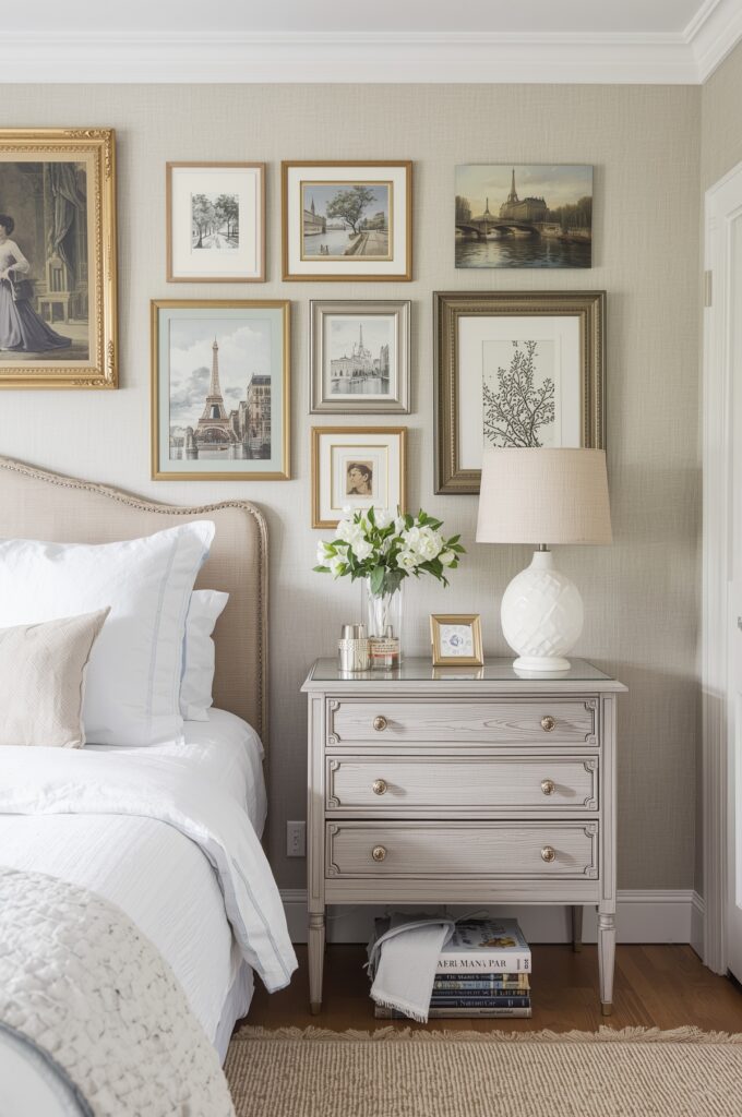 From vintage Parisian posters to romantic oil paintings, French bedrooms thrive on curated wall art.