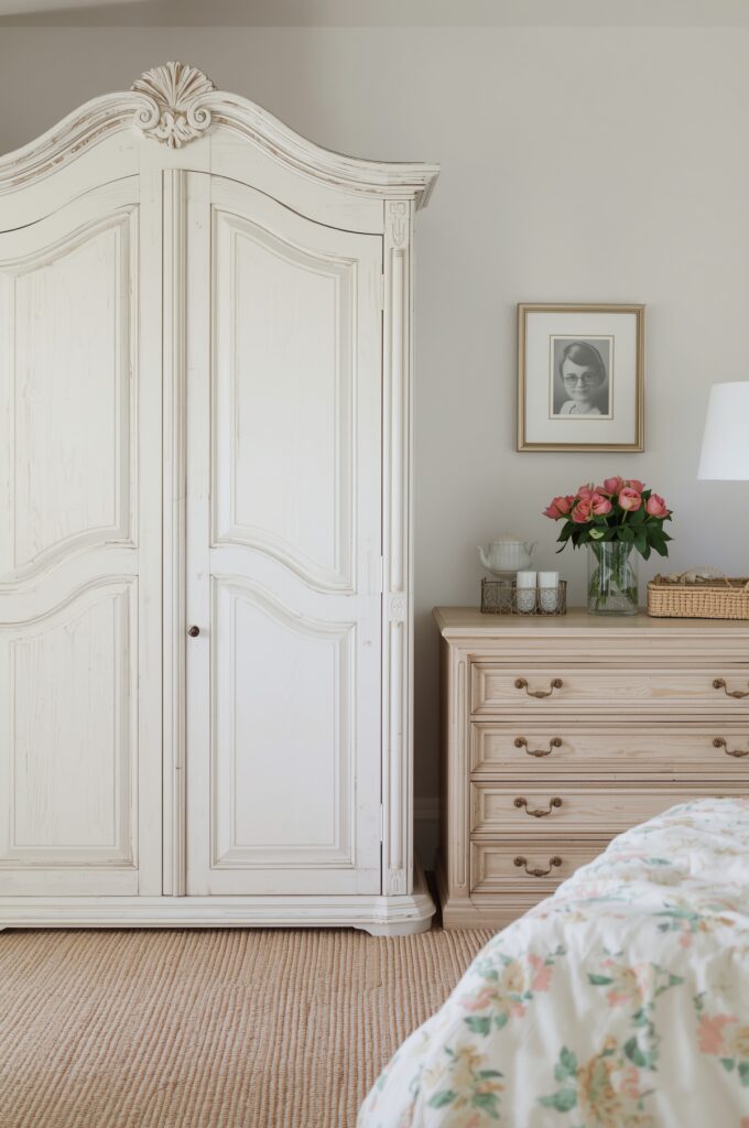 Opt for distressed wood or painted antique armoires. They’re not only functional but instantly create a French-country vibe.