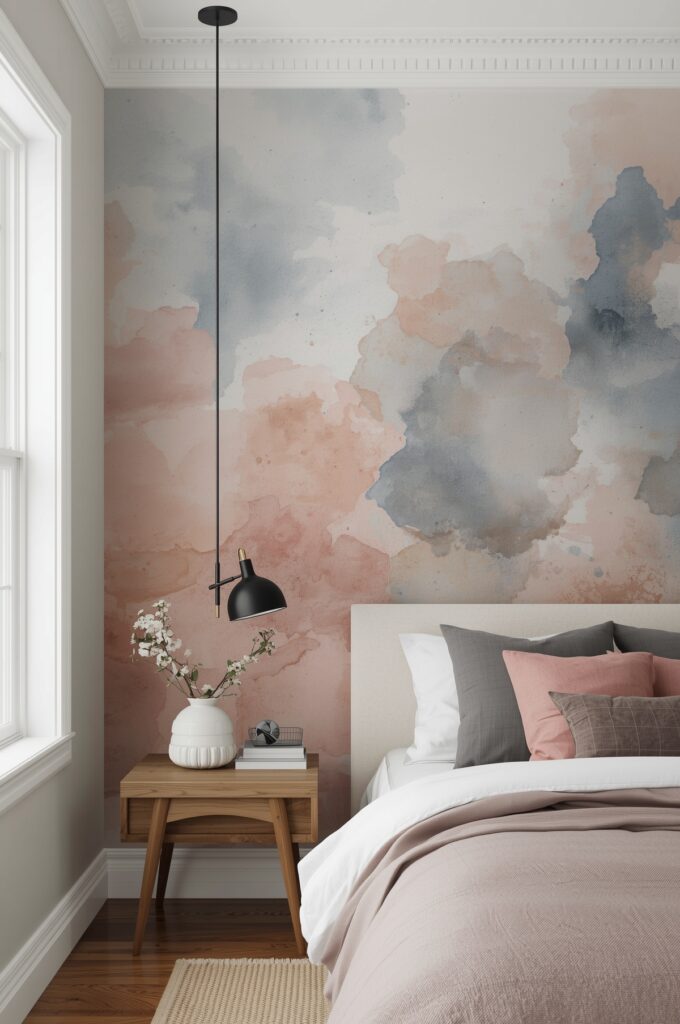 Soft watercolor strokes in pastel or muted tones create dreamy, elegant backdrops for bedrooms and lounge spaces.