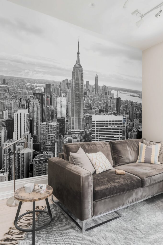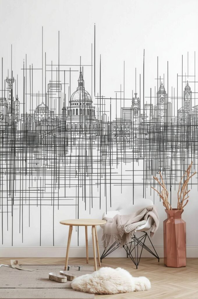 Minimalist sketch-style murals with monochrome tones exude sophistication and are ideal for contemporary interiors.