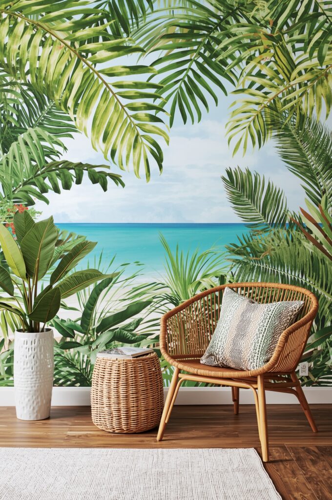 Palm leaves, beaches, and exotic plants create a vacation-like vibe, perfect for living areas and sunrooms.