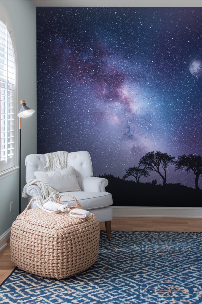 Celestial skies, stars, and planets create enchanting, otherworldly vibes—perfect for bedrooms or creative studios.