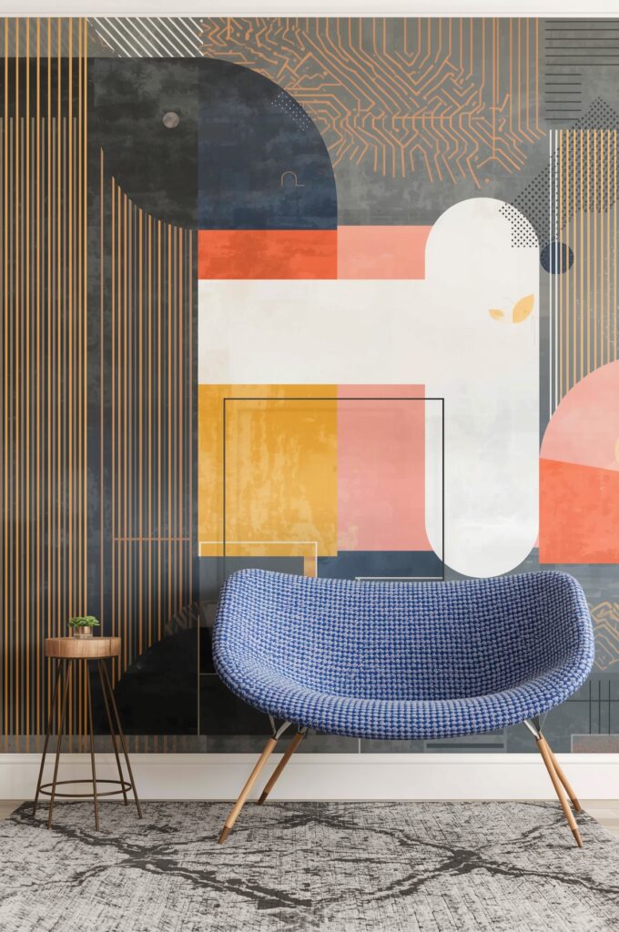 Bold geometric shapes, lines, and patterns in vibrant colors make for a striking modern look. Perfect for accent walls in living rooms or offices.