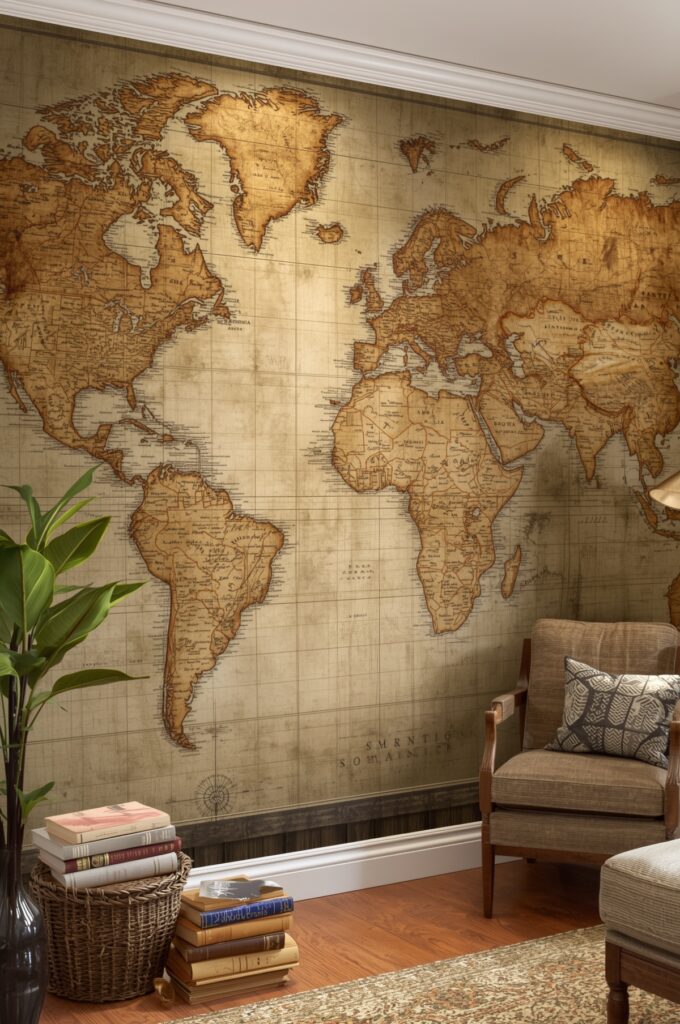Classic world maps or old cartography prints bring charm and sophistication to study rooms or libraries.