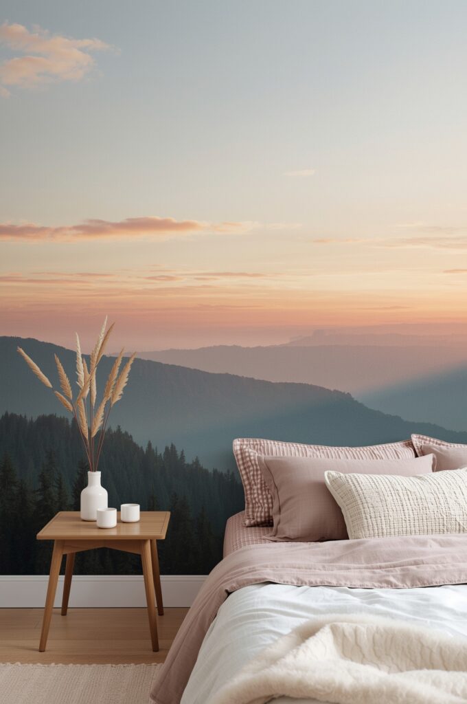Painted horizons, sunsets, or mountain ranges create depth and serenity in bedrooms and lounges.
