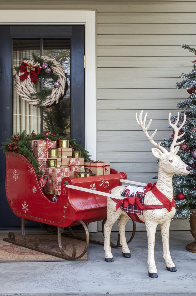 Place a decorative sleigh and reindeer set near your porch, filled with wrapped boxes or lanterns. It’s a timeless outdoor decoration that feels both festive and nostalgic.