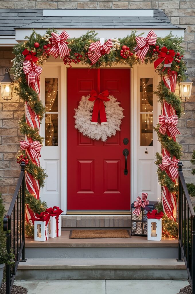 If you prefer a clean, traditional aesthetic, stick with a red-and-white color palette. Mix candy-cane stripes, red bows, white wreaths, and warm lights for that cheerful North Pole vibe that everyone loves.