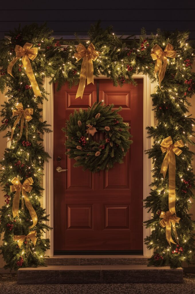 Start with the first thing everyone sees — your front door! Wrap lush garlands around your doorway, weaving in fairy lights, red berries, and golden ribbons. Add a large, elegant wreath to complete the look. A well-lit entryway instantly feels warm, welcoming, and festive.
