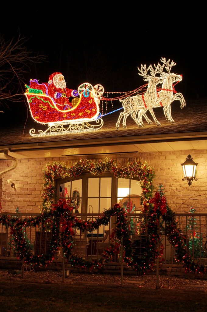 For the ultimate “wow” factor, set up Santa’s sleigh with reindeer on your roof or balcony. Use lightweight, secure decorations and warm lighting to make it look like Santa is about to take off into the night sky.
