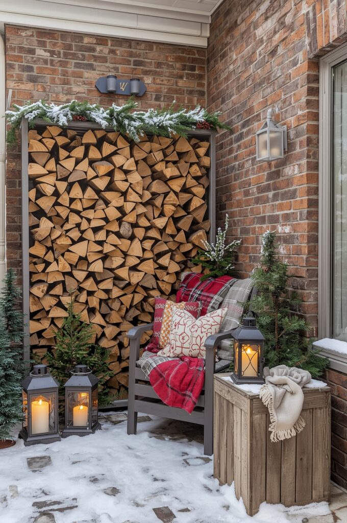 Create cozy corners with stacked firewood, glowing lanterns, and rustic crates. Add faux snow and a few small pine trees to make it look naturally festive and charming.