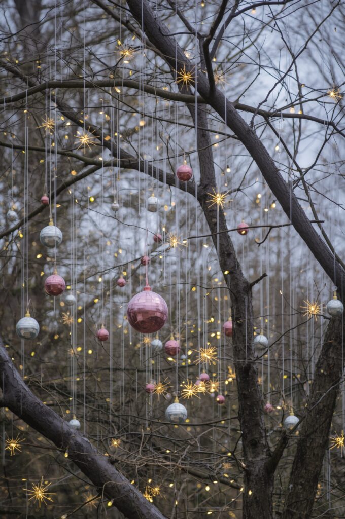 Hang large, reflective ornaments from tree branches using transparent strings. As they sway in the wind and catch the light, they create a dreamy, magical effect.