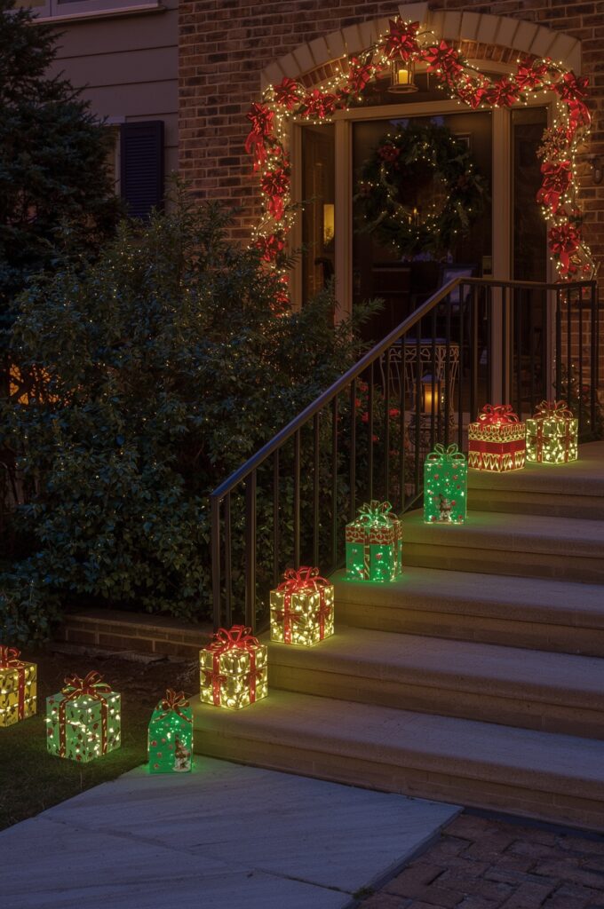 Scatter illuminated gift boxes around your yard, porch, or steps. These glowing presents bring color, joy, and a sense of surprise — perfect for nighttime charm.