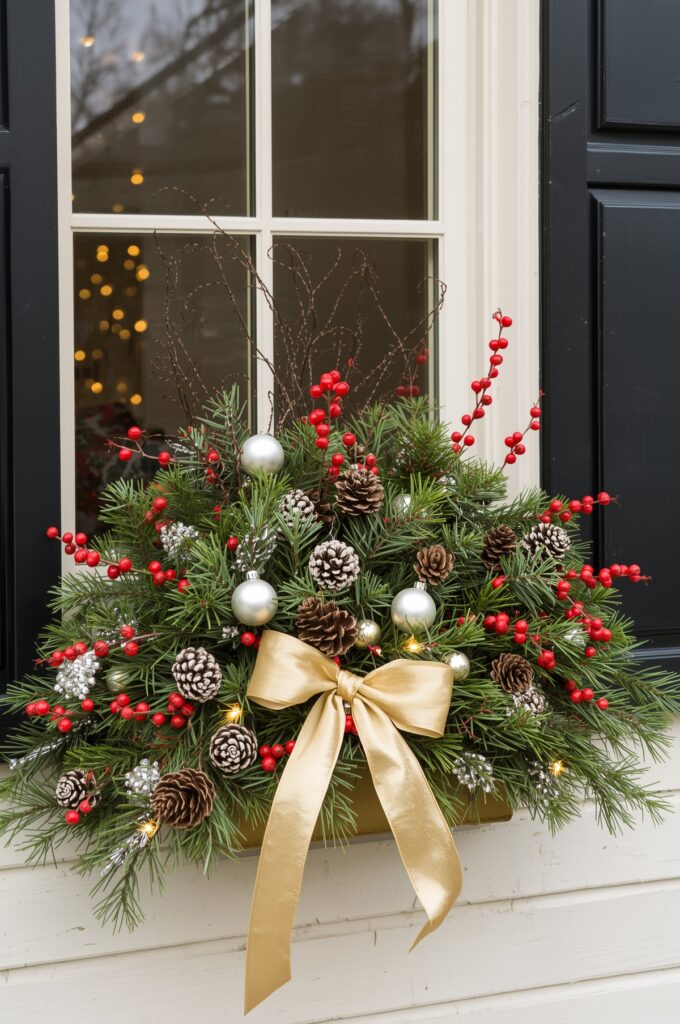 Dress up your window boxes with pine branches, red berries, pinecones, and small ornaments. Tie it all together with satin bows and mini LED lights for a glowing, sophisticated look.