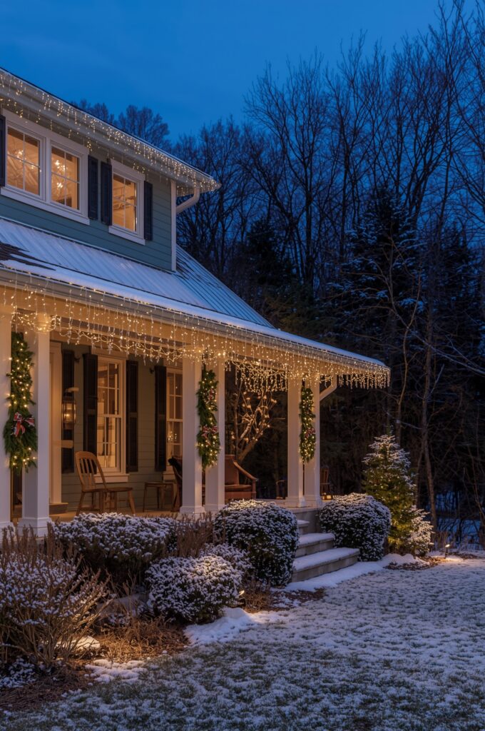 Nothing says “winter magic” like icicle lights hanging from your roof. Choose warm white for a soft glow or cool white for an icy, snow-inspired look that feels elegant and modern.