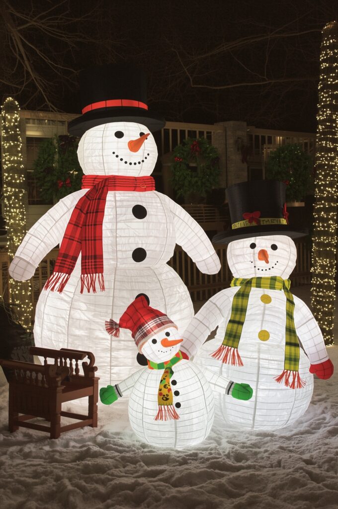 Go beyond one snowman — create a snowman family! Use inflatables, LED models, or traditional snow builds. Give them scarves, hats, and a touch of humor for a fun neighborhood favorite.