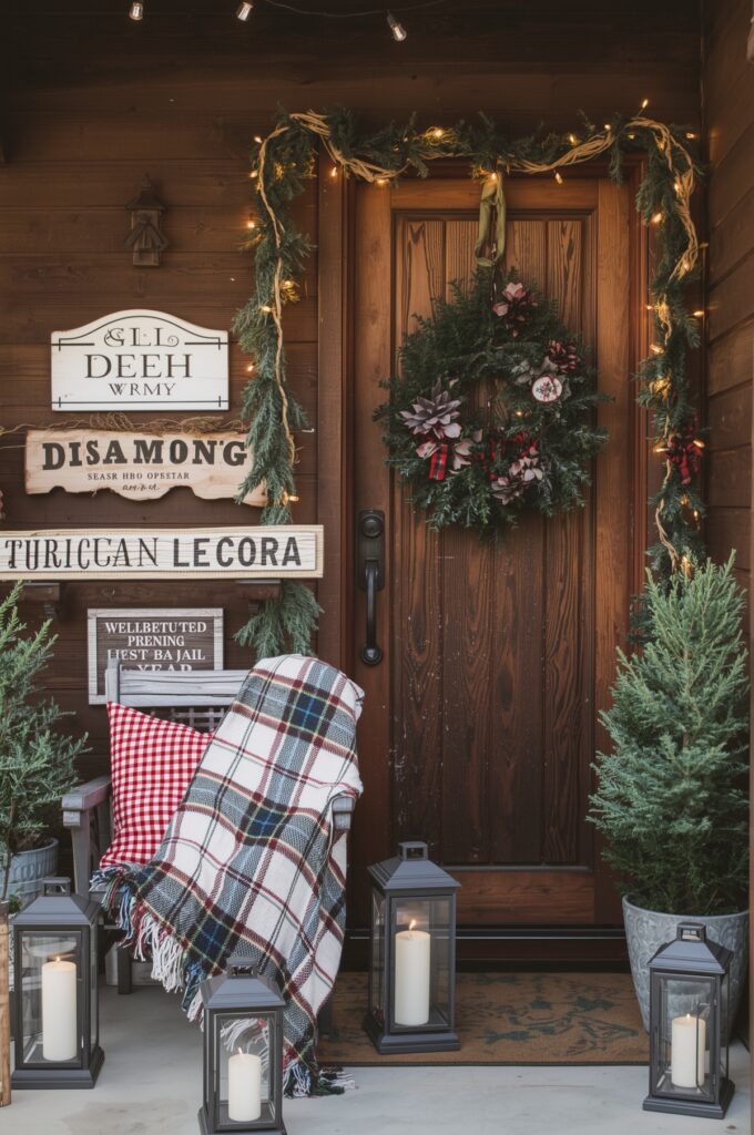 For a rustic charm, decorate your porch with wooden signs, plaid blankets, lanterns, and potted evergreens. Add string lights for warmth and vintage flair. It’s like a Hallmark movie scene come to life.