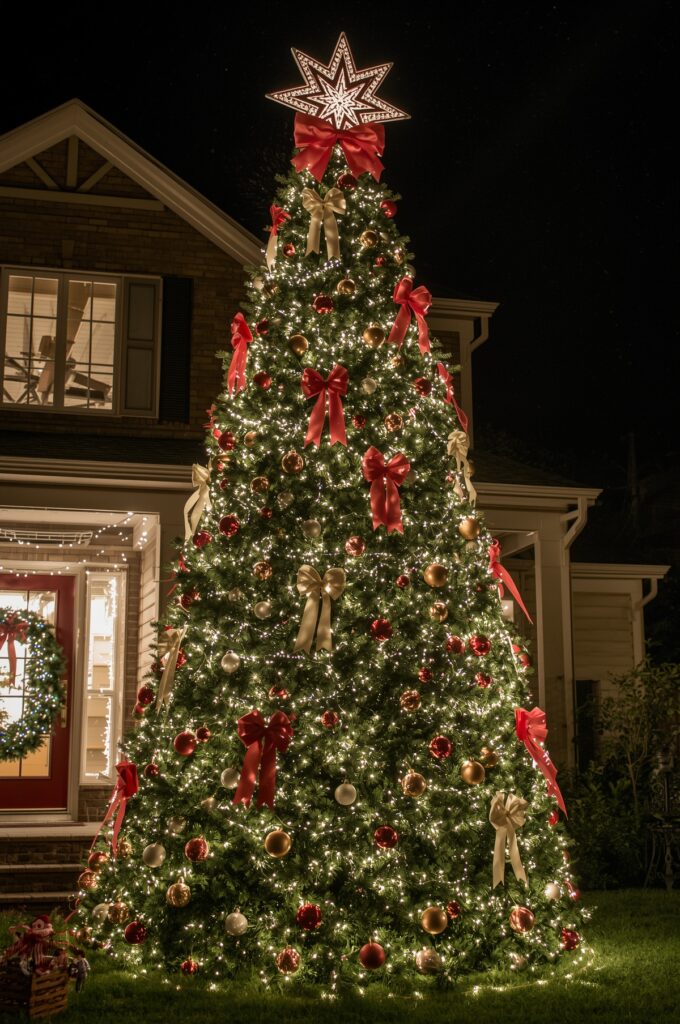 A statement tree in your front yard or porch is a showstopper. Decorate it with waterproof ornaments, oversized bows, and sparkling fairy lights. Top it off with a star that shines bright from a distance!