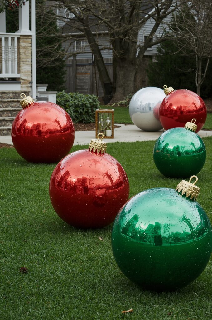 Supersized ornaments scattered across your yard create an eye-catching display that feels straight out of a Christmas movie. You can DIY them using painted beach balls or buy pre-made giant baubles in metallic red, silver, and green for that glitzy holiday vibe.