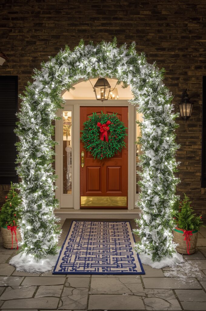 Frame your walkway or entrance with an arch made of faux snow, garlands, and LED lights. Guests will love walking through your personal “North Pole gateway.”