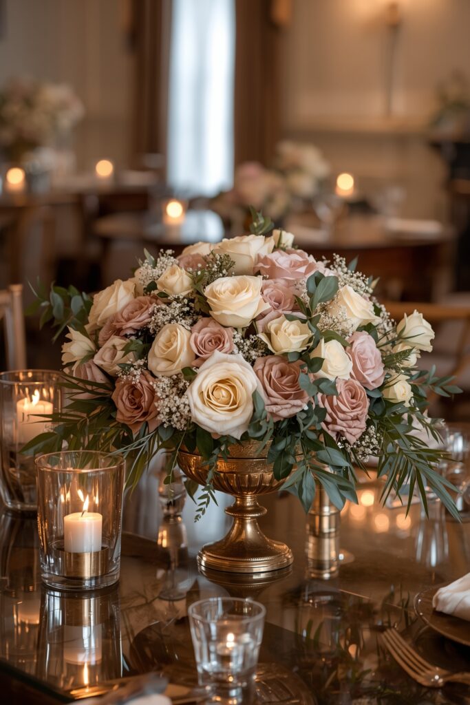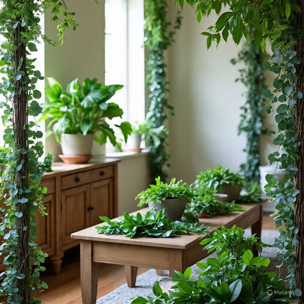 For a more natural vibe, use eucalyptus garlands, potted plants, or leafy centerpieces to bring freshness indoors.
