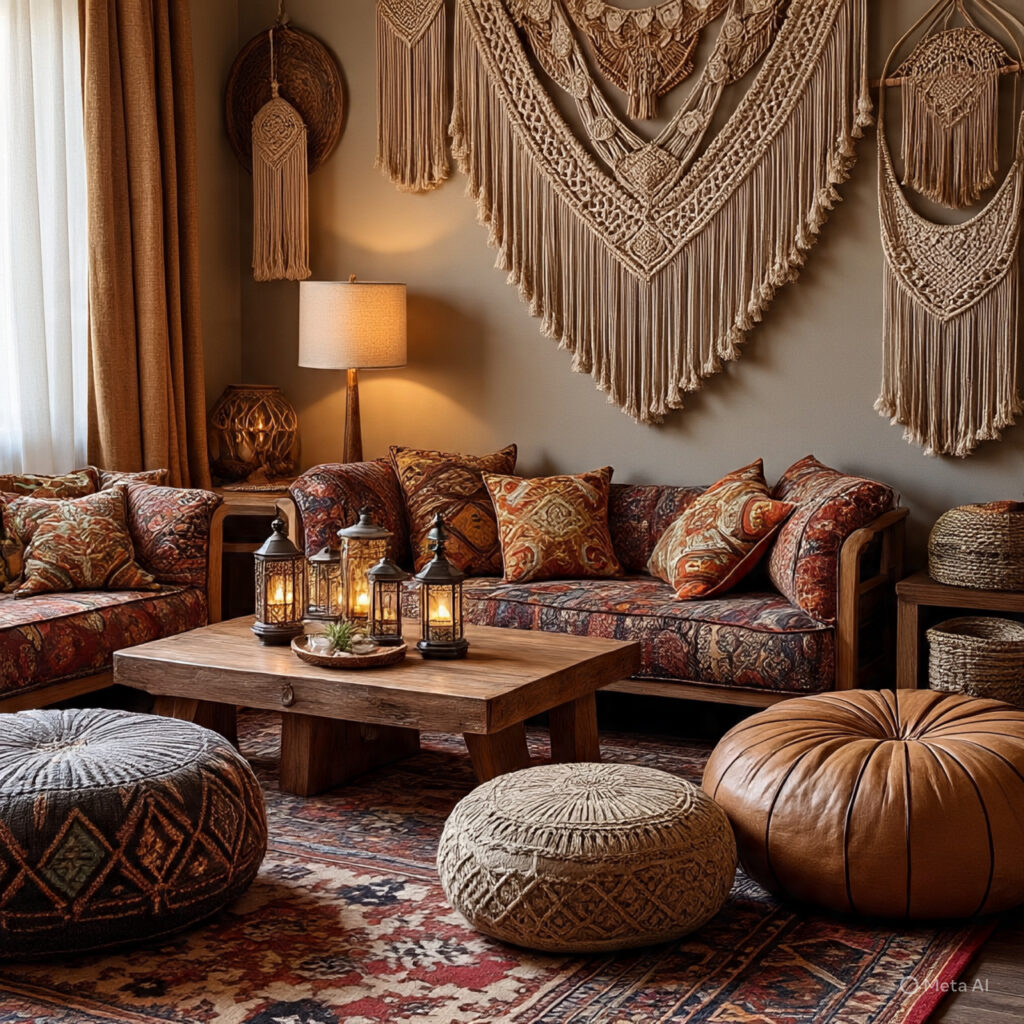 Use floor cushions, poufs, and low tables decorated with patterned rugs and boho lanterns for a relaxed vibe.