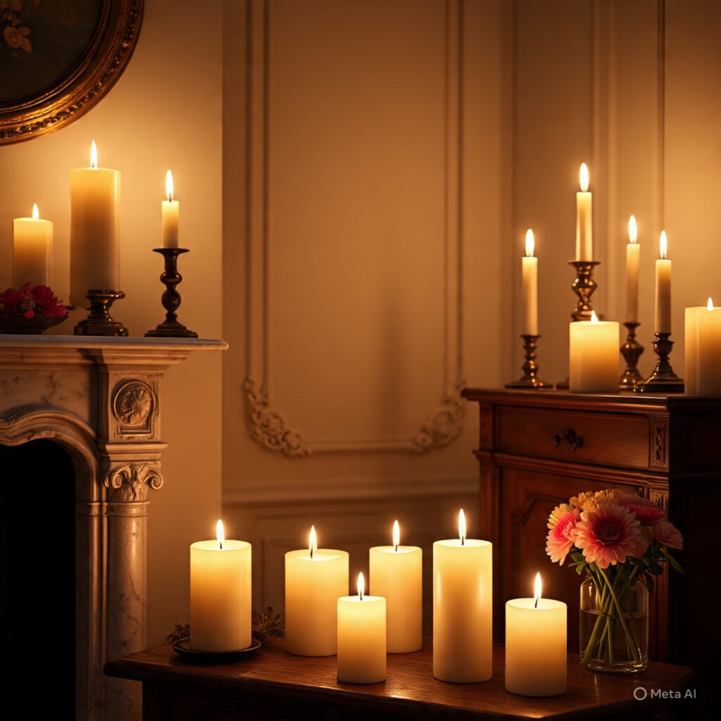 Cluster candles of varying heights on tables or mantels. Scented candles add fragrance while pillar candles provide ambiance.