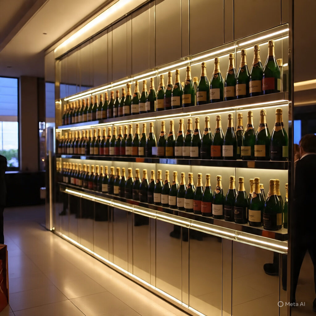 Instead of a traditional bar, try a champagne wall where guests can grab a glass from an elegant backdrop.