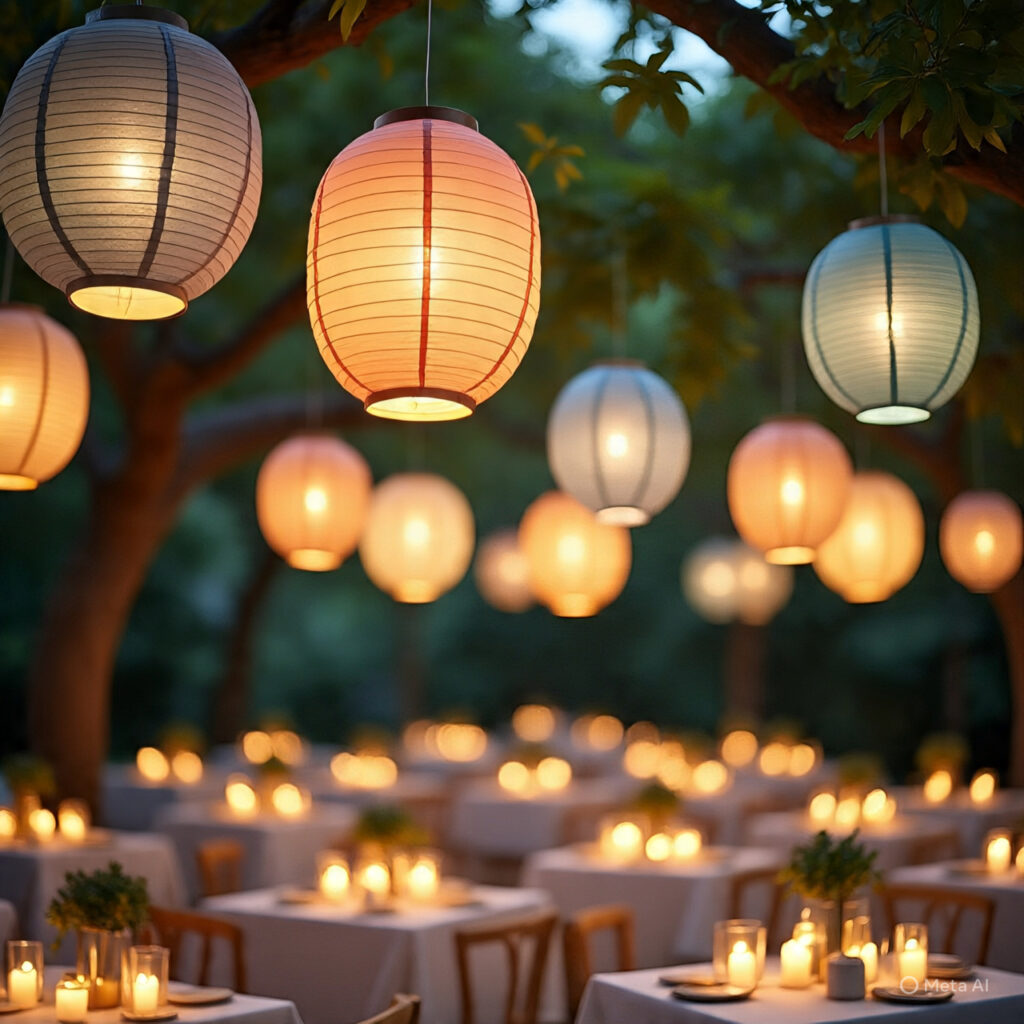 Paper or fabric lanterns in metallic or pastel shades look stunning hanging above the party space, especially outdoors.