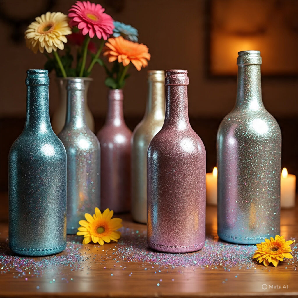 Upcycle old wine bottles by painting them and sprinkling with glitter. Use them as vases, centerpieces, or even candle holders.