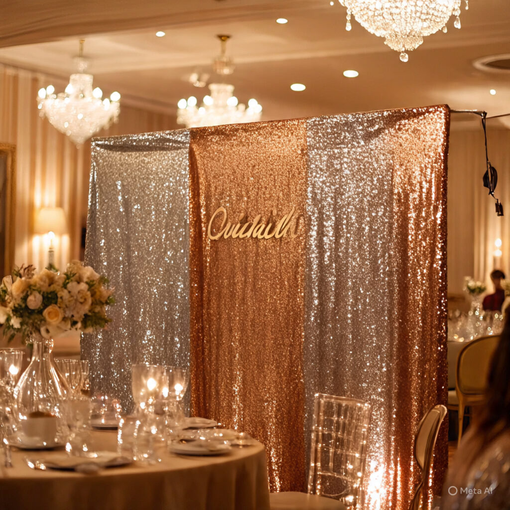 For Instagram-worthy photos, install a glittery sequin backdrop in gold, rose gold, or silver. Perfect for a glamorous birthday or cocktail party.
