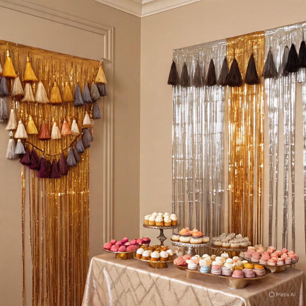 Hang tassel garlands in metallic tones across walls, doorways, or dessert stations for a playful touch.