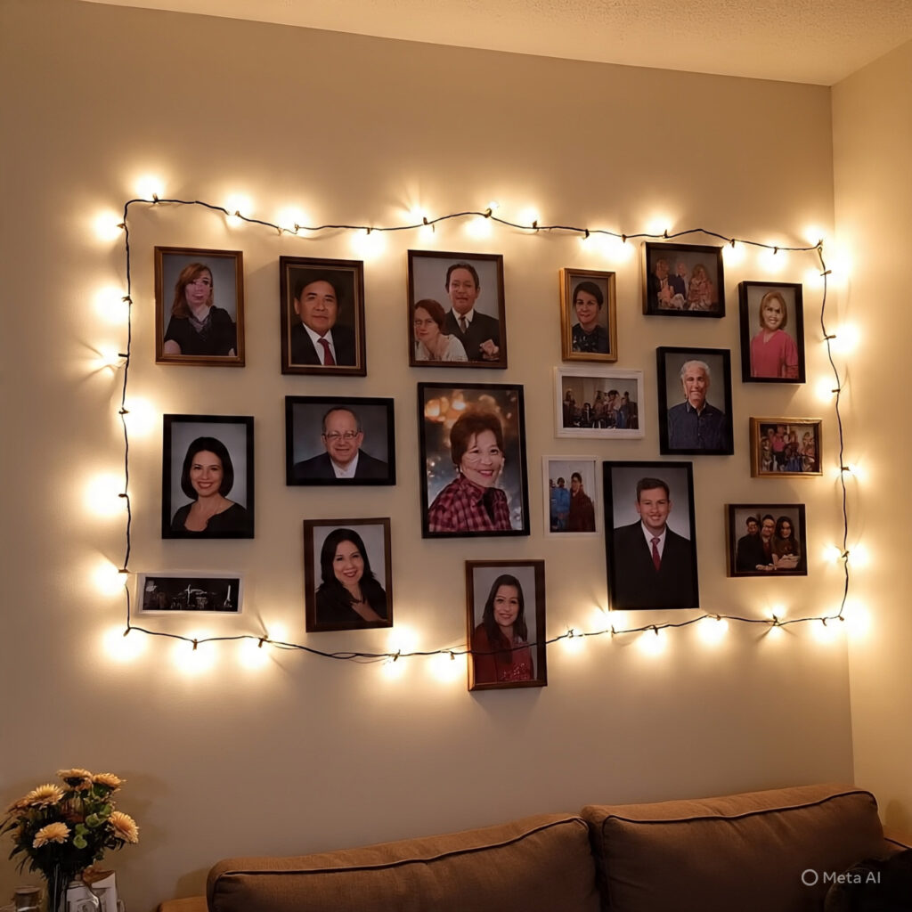 Celebrate milestones with a gallery wall of photos featuring the guest of honor. Add fairy lights around the collage for extra charm.