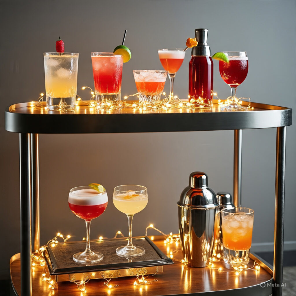 Decorate a bar cart with themed drinks, stylish glasses, cocktail shakers, and fairy lights for a sophisticated party focal point.