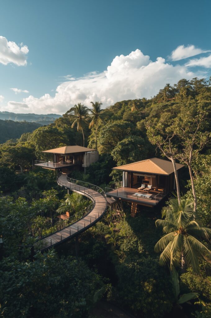 Elevated villas amidst treetops provide thrilling views and an adventurous vibe.