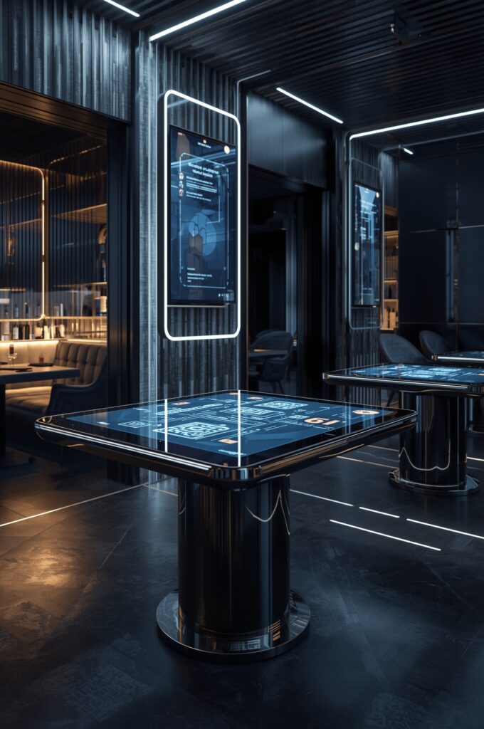 Smart tables, QR-code menus, and AI-powered lighting enhance the dining experience while reflecting the future-forward direction of hospitality design.