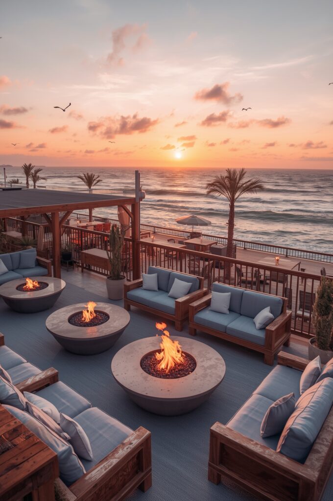 Seaside-themed rooftop bars with breezy décor, fire pits, and panoramic views are among the hottest outdoor restaurant concepts in 2025.