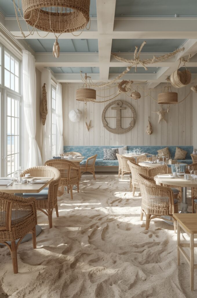 Nautical blues, sandy textures, and airy designs bring seaside vibes into restaurants, even if they’re in the heart of the city.