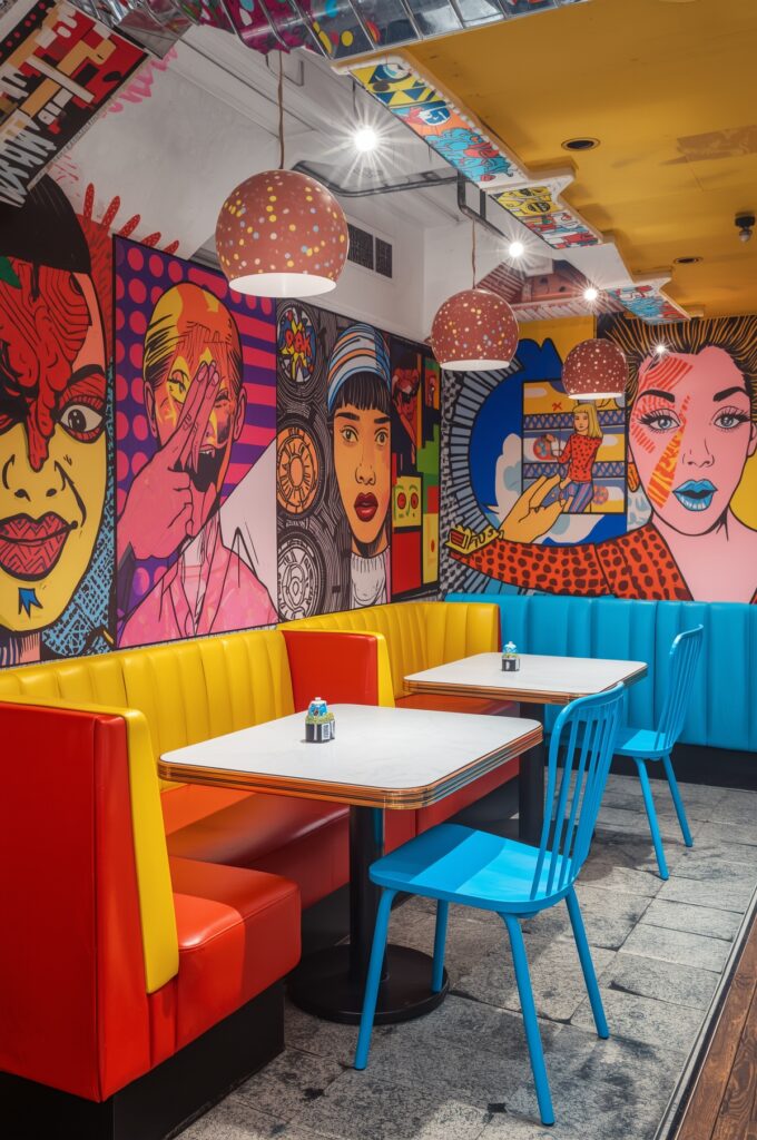 Bright murals, playful graphics, and bold colors make pop-art restaurant designs trendy among younger diners seeking a lively vibe.