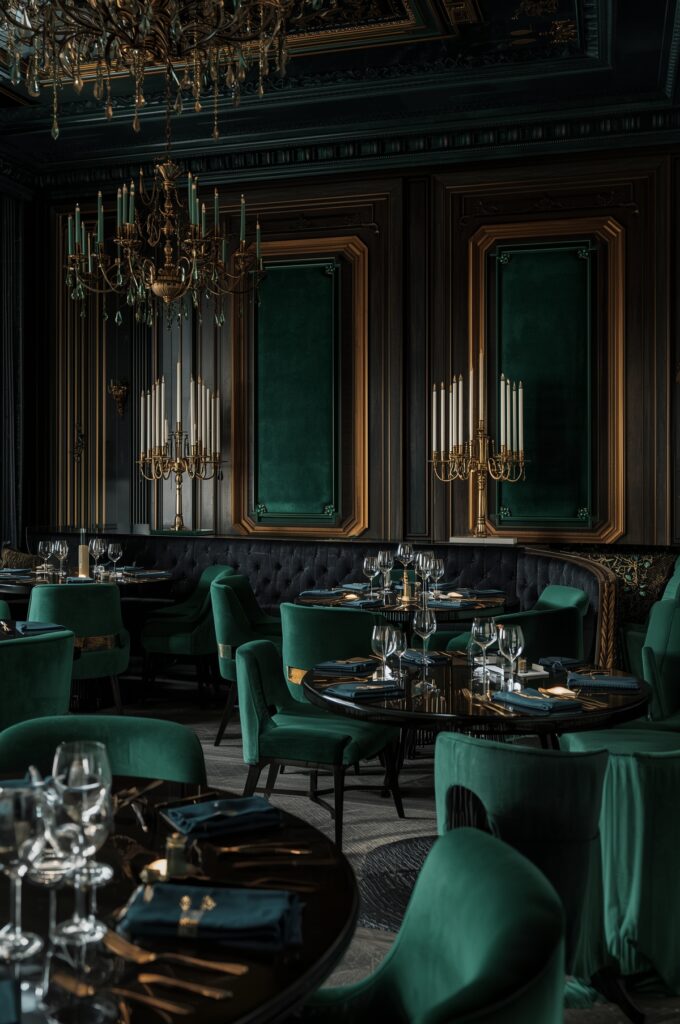 Deep tones like emerald, navy, and black paired with gold accents create an intimate, luxurious atmosphere perfect for fine dining.