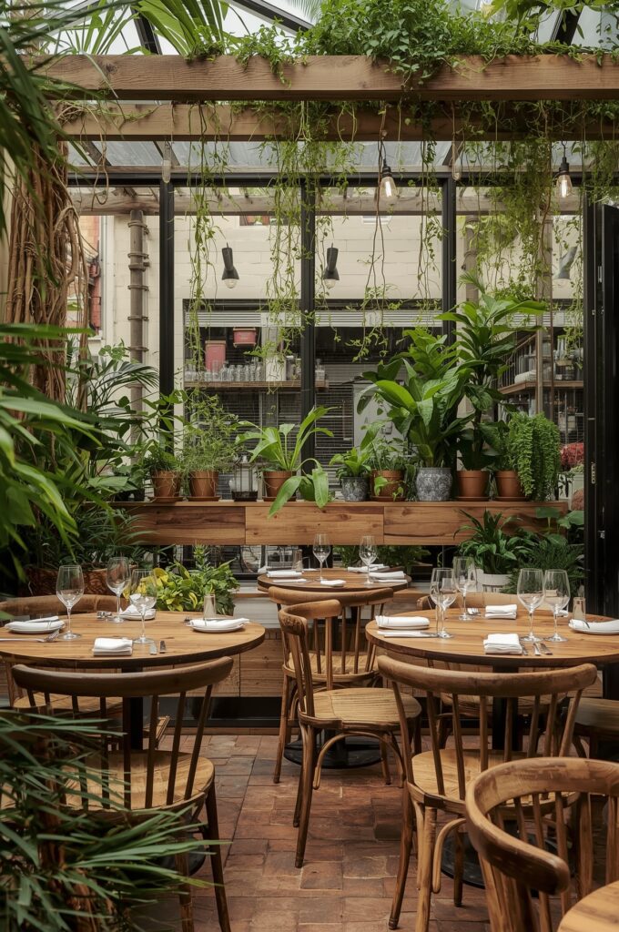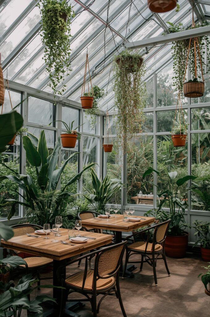 Glass walls, hanging plants, and abundant sunlight create the feel of dining inside a modern greenhouse—ideal for brunch spots or wellness-focused eateries.